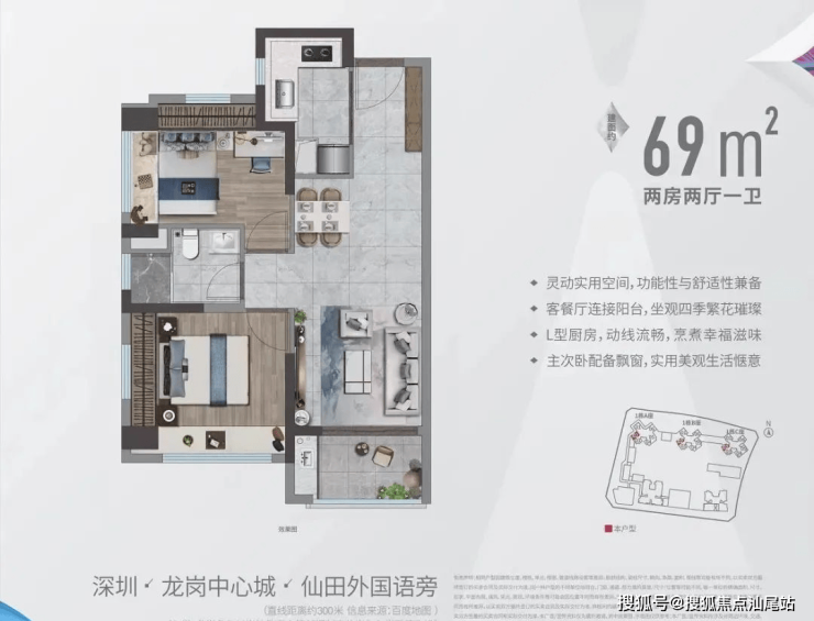 69㎡的2房2厅1卫,设计的是竖厅格局,客厅2.77米开间(实测),进深9.62米,主卧双飘窗,2个卧室分别做到了主卧10.2㎡/次卧8.87㎡(实测面积,去掉墙体),得房率约70.9%(不含赠送),西南朝向。