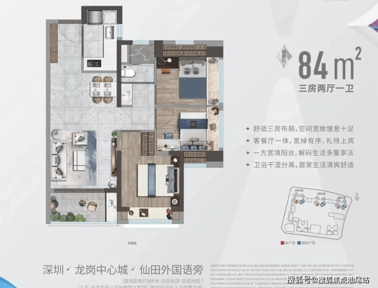 84㎡的3房2厅1卫,设计的是竖厅格局,进门入户玄关,客厅3.16米开间(实测),进深9.63米,动静分区,3个卧室分别做到了主卧9.72㎡/次卧8.57㎡/次卧7㎡(实测面积,去掉墙体),得房率约70.91%(不含赠送),东南朝向。