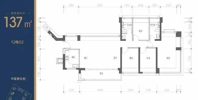 137㎡的4房2厅2卫,设计的是横厅南北通透格局,超宽展面,动静分区,五开间朝南,主卧三面观景飘窗,L型厨房,公卫三段式分离,得房率约90%(包含赠送)。