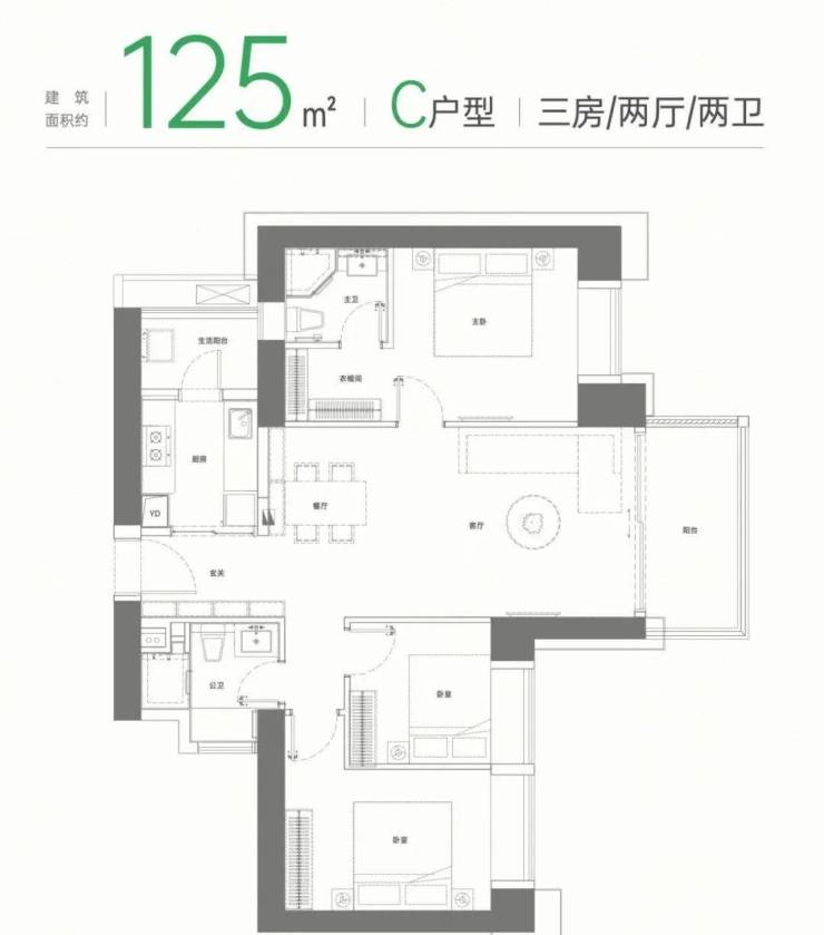 125㎡三房:户型多样,不同朝向均有采光。设置入户玄关,兼具隐私和收纳功能。飘窗和阳台拉开居住视野,主卧私享功能完备。LDK一体化设计打造无边界、社交化的餐客厨系统,让居民在烹饪、用餐和娱乐中都能感受到家的温馨与舒适。