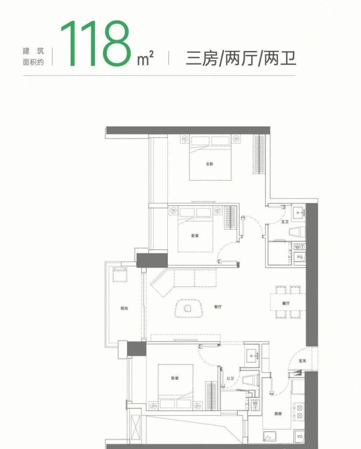 118平三房两卫这个户型采用了双龙抱珠设计,仅有64套,同样做到了客厅卧室同一朝向,且都朝西南,采光面非常足。