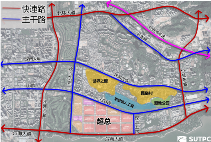 “十字”代表着南北中轴的深湾绿谷和东西轴线的未来城脊,南北中轴实现中轴分时段无车化管控,东西轴线导入超级枢纽和特色总部街区;“生境”为山海连接,生态通廊。此外,片区最东侧南北向道路深湾五路为连接华侨城内湖湿地与深圳湾的主要鸟类迁徙通道