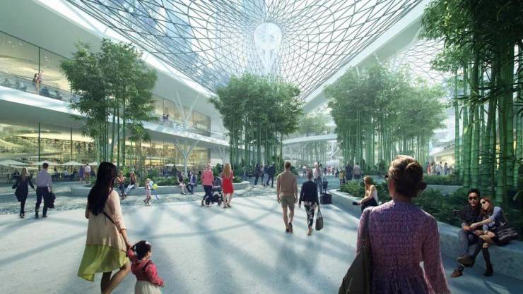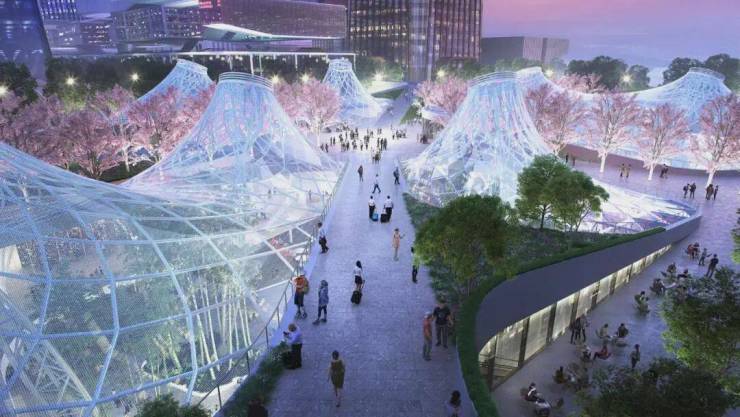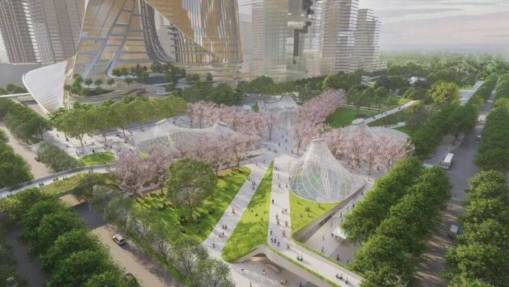 中央绿轴中段为车站广场,该广场 “水晶山丘” 屋面覆盖着地下枢纽大厅,在地面创造出独特的城市地标,与地下繁忙的共享大厅、地下森林、地面广场、周边建筑之间建立视觉联系,成为公园美景的一部分。