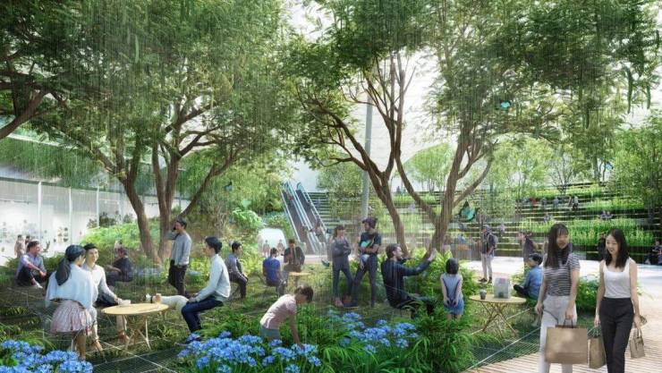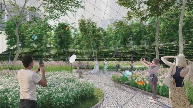 沿深湾公园路将设置自然主题的艺术花园。连接B1层和地下商业的下沉广场,将设计为大榕树凉荫下的雨林花园,创造独特的聚会场所。