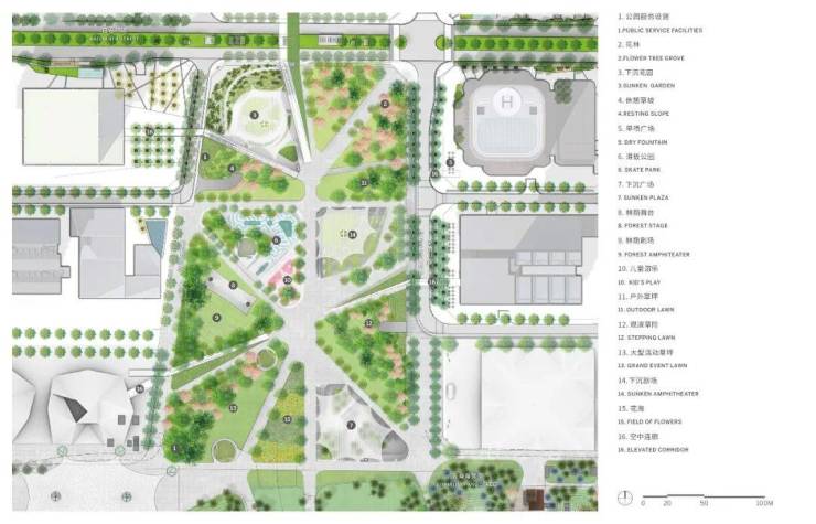 中央绿轴南段为演绎与艺术公园,是艺术表演群体和爱好者们交流、练习、演出和欣赏的空间。