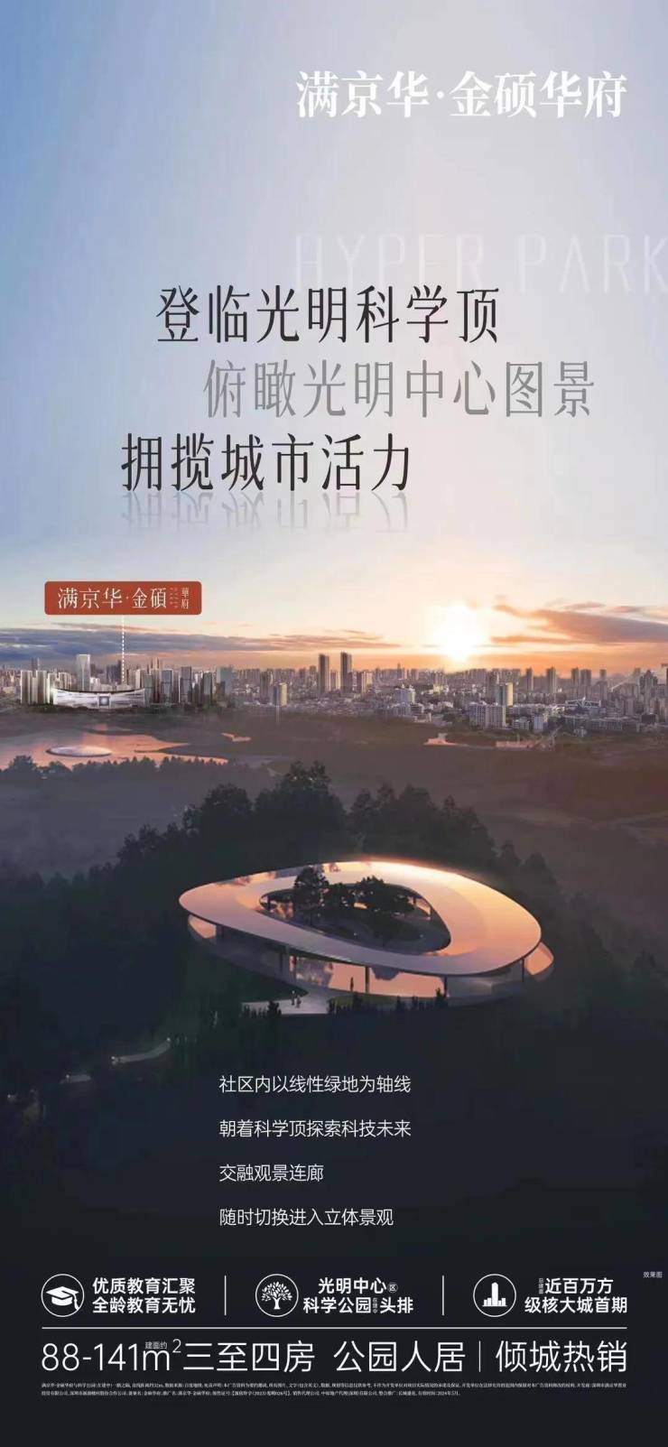 总结:雄踞光明中心区,不仅地段出色,满京华·金硕华府 项目是一个近百万方的综合体大城,包含有高端住宅、办公、商业、配套等,是光辉大道上的重要展示界面。科学公园头排物业,学校、市政等配套都是整个光明的顶级配套产品力强,高性价比,是满京华在光明重点打造的优质大盘,满京华·金硕华府 预计推售建面约88-141㎡3-4房产品看点十足,非常值得期待!