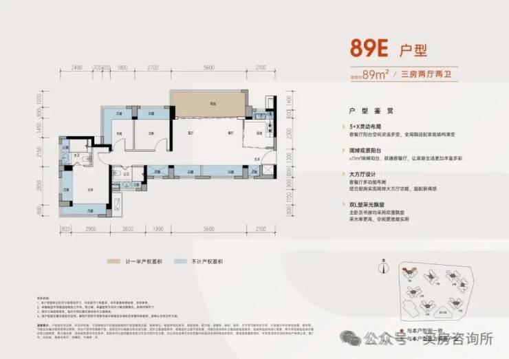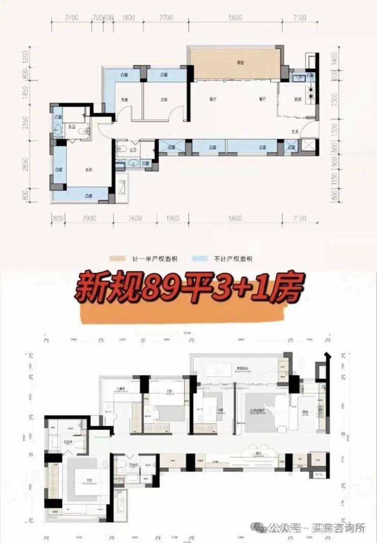 这里89E户型据了解可以改为3+1房四房,但是虽然说是改四房但是是牺牲了餐厅改为房间,他把餐厅放到了飘窗位但是有点拥挤,或者可以学润宏城一期把餐厅放到厨房一体化,当然如果不改四房单纯做三房两卫,这个户型还是挺能打的,整体空间都挺大,而且还是双面采光