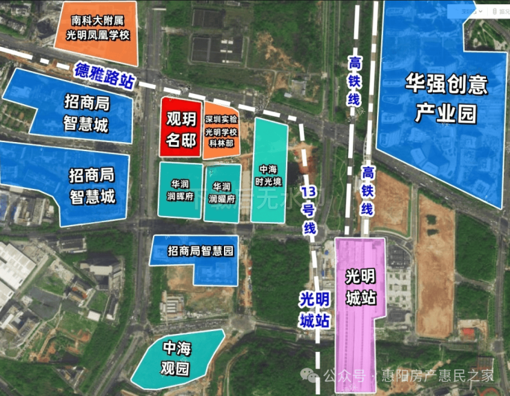 项目交通便利性突出,实现"三轨三高速"立体交通网络。距离在建的13号线德雅路站仅100米(预计2026年中开通),7站直达南山科技园等核心区域;1站可达光明城站,换乘6号线支线二期(2025年年内开通)及广深港高铁、赣深高铁,30分钟直达香港西九龙、广州等城市。