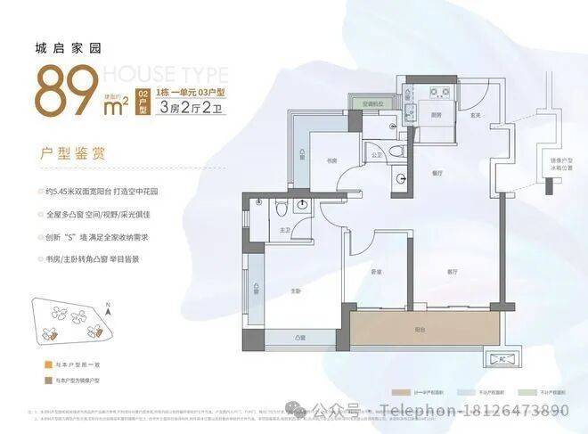 89平竖厅户型,拥有一个约5.45米的超大景观阳台,可以满足各种不同的需求,比如做空中花园、阳光茶室、健身区等。