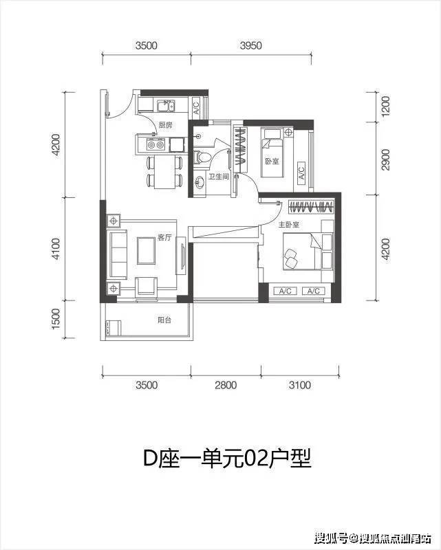 D栋一单元02户型:88㎡ 3房2厅1卫