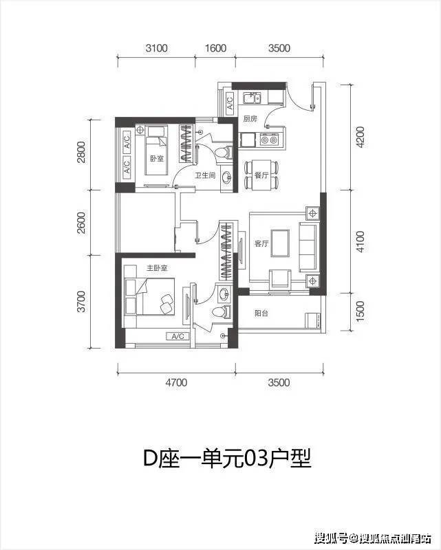 D栋一单元03户型:93㎡ 3房2厅2卫
