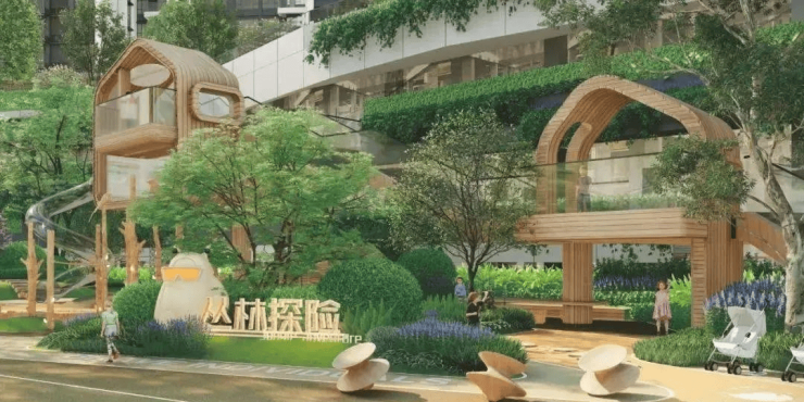 设置瞭望塔、树屋、攀岩墙等分龄段游戏区,高绿量的户外亲子互动场地。