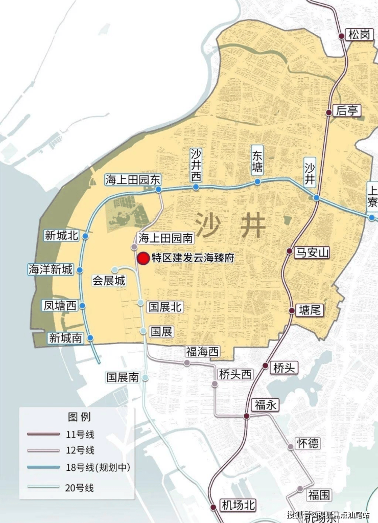 特区建发云海臻府近 12 号线海上田园南站。与海上田园南站直线距离约250米。12号线方便通达宝安西乡、南山、蛇口等区域。离已通车的地铁站 20 号线(一期)会展城站较近,直线距离约800米(根据百度地图测量,仅供参考)。20号线二期(规划中)将作为一期工程的南延段,联络宝安西乡、南山传统中心区、福田香蜜湖金融中心、福田深港科创合作区等区域。