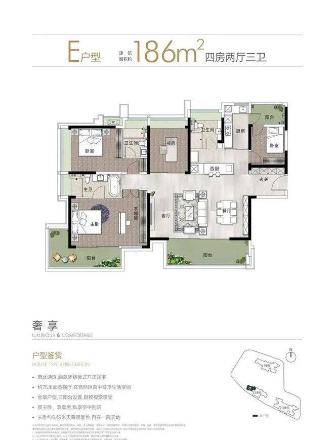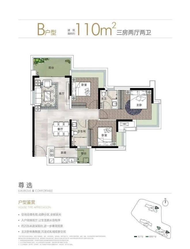 主力户型包括建面约90平方米和110平方米的A、B户型,均配备全尺寸飘窗/转角飘窗及宽敞阳台,充分利用自然景观资源。此外,特别设置了建面约153平方米和186平方米的大户型,位于一单元和二单元末端,独享中山公园的景观资源。