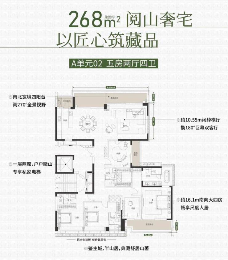 同样的专梯入户,豪宅感扑面而来,该户型为顶级大户型,四阳台设计,最大有10.55米的景观阳台和180度视野的餐客厅空间奢阔气场尽显,罕见的南北瞰景四阳台设计,让家的每个角落都能欣赏美丽的山景和城市景观。所有的开窗面都尽可能放大,客餐厅、书房、卧室、几乎都能享受超宽超大屏