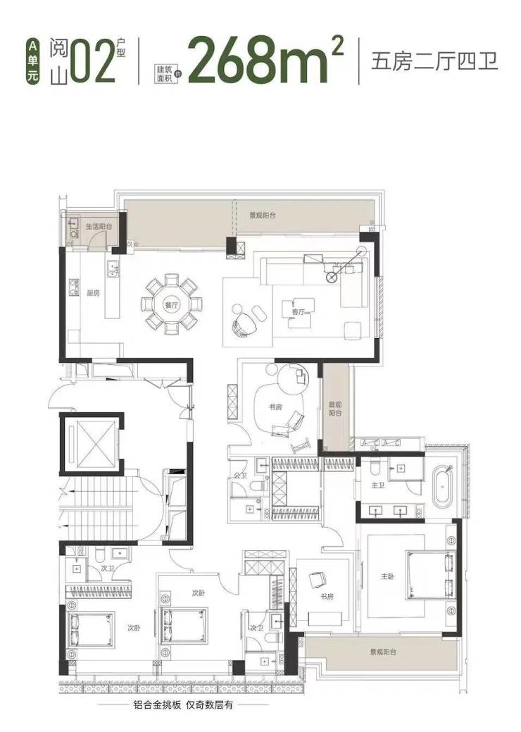 建面约268㎡的大平层户型,为五房四卫三套间设计,动静分区,将生活与居住空间相对分隔。
