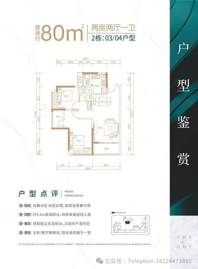 80㎡3房2厅1卫(单价7万-7.6万-总价570-610万)客厅朝南带阳台,主卧朝南,次卧朝西该户型分布在2栋03,04号房