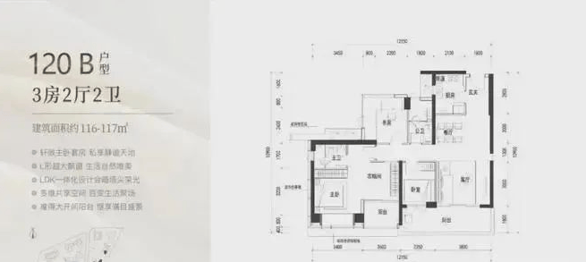105㎡的3房2厅2卫,B户型(2栋3单元02/06户型),设计的是经典竖厅格局,客厅3.6米开间,LDKB一体化设计,三开间朝南,动静分区,3个卧室分别做到了主卧13.12㎡/次卧9.9㎡/次卧8.4㎡(包含墙体飘窗),客厅连接次卧出6.4米长的宽景大阳台,U型厨房,卫生间干湿分离,得房率约90%(包含赠送),正南或东南朝向。