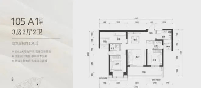 104㎡的3房2厅2卫,A1户型(2栋3单元03户型),设计的是竖厅类双龙抱珠格局,客厅3.6米开间,客餐厅一体化设计,3个卧室分别做到了主卧12.8㎡/次卧12㎡/次卧8.7㎡(包含墙体飘窗),客厅连接次卧出6.5米长的宽景大阳台,U型厨房,公卫三段式分离,得房率约90%(包含赠送),东南朝向。