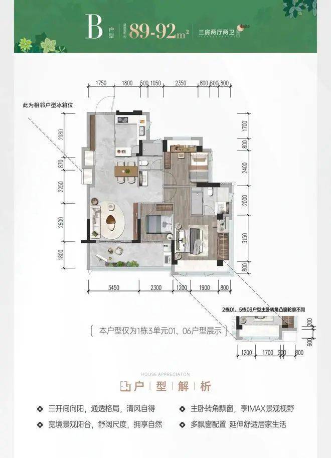 这个是主力户型,主要分布于1栋3单元的01/02和06/07户型,其中01/02是西南朝向看华发冰雪世界;06/07是东南朝向看小区花园。
