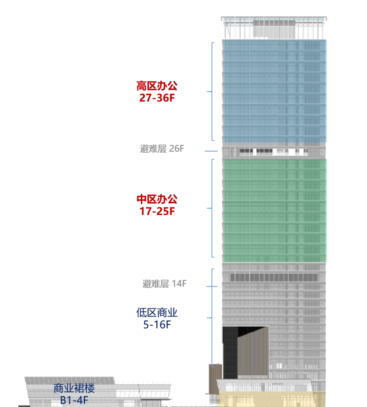 塔楼办公:位于17-36层,整体面积约27767.36㎡,单层面积约1460㎡
