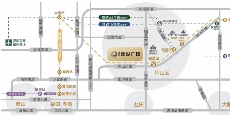地铁:紧邻地铁14号快线坪山门户站——锦龙站700米(已通车),12站福田岗厦北。地铁16号线(预计2022年内通车)、地铁33号线(在建)