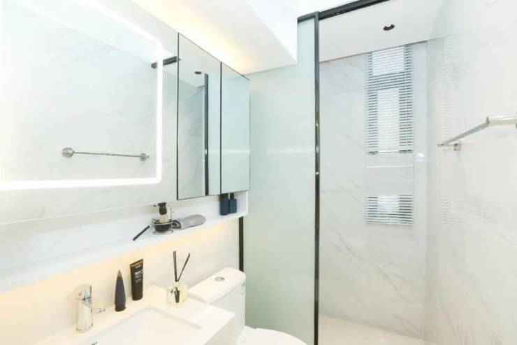 洗手间:明卫设计,标准的三段式干湿分离,将淋浴间、马桶、洗手台进行了分离设计,使卫生间环境更加的整洁美观;