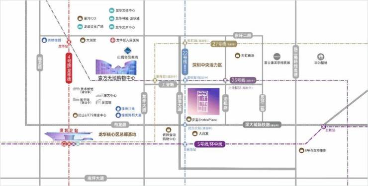 4/5/6/10号线已通车,22/25/27号线(规划中)交汇于龙华油松片区,畅达深圳北站、福田CBD、后海中心区