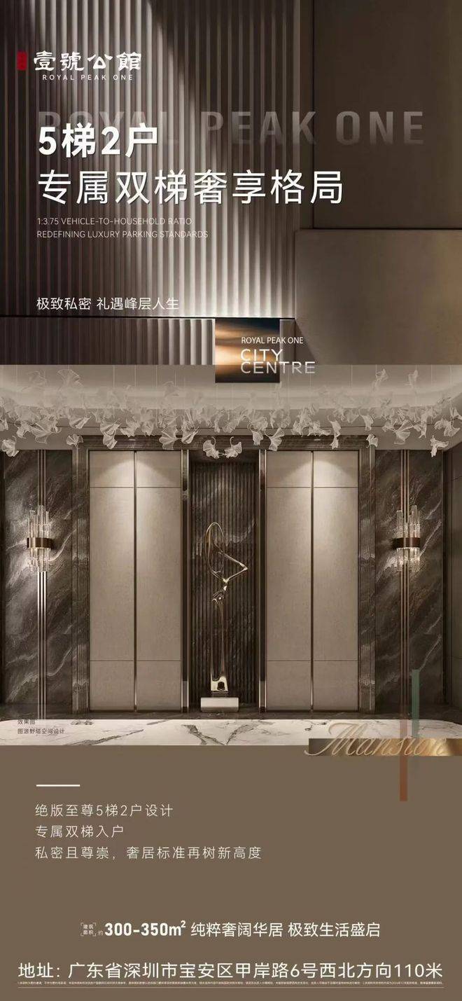 臻藏户型:纯粹大户型社区(仅300、350两种户型);稀缺板式结构,户户南北通透,得房率高;独享6.8米大堂层高;独享两部电梯入户(五梯两户),1:3.75超高车户比,绝版的豪宅标准,归属顶尖人群的量身定制。
