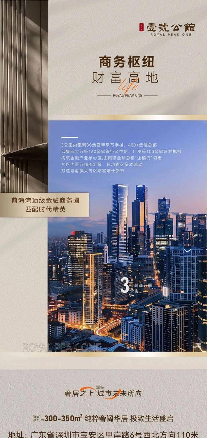 项目位于宝安中心区,项目地处于甲岸路与金桂街的交汇处,雄踞前海中央最核心的位置,项目总建面20.2万平米,由五栋南北通纯板楼组成,五梯两户,共计420套单位,主推250/300/350平4-6房大户型。
