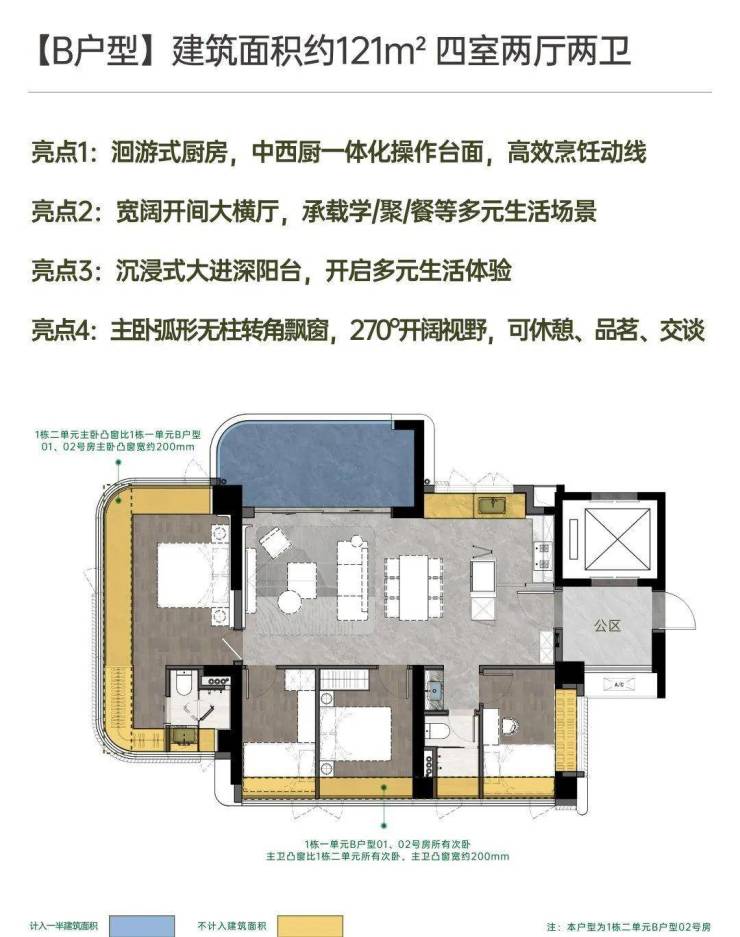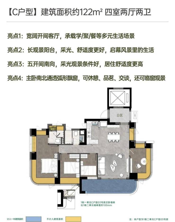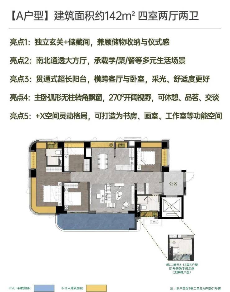 建面约142㎡南北方厅 阔景四房;