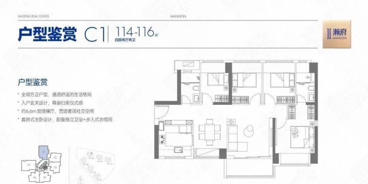 114㎡的4房2厅2卫,C1户型,设计的是横厅南北通透格局,客餐厅6.6米开间,LDKB一体化设计,四开间朝南,全屋7面飘窗,主卧套房+步入式衣帽间,3个次卧朝西北向,得房率约78%(不含赠送),U型厨房,卫生间干湿分离,东南朝向。