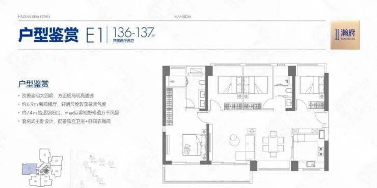 136-137㎡的4房2厅2卫,E1户型,设计的是横厅南北通透格局,客餐厅6.9米开间,LDKB一体化设计,四开间朝南,全屋7面飘窗,主卧套房+步入式衣帽间,3个次卧朝东北向,得房率约78%(不含赠送),U型厨房,公卫三段式干湿分离,客厅连接次卧出7.4米长的超大阳台,西南朝向。