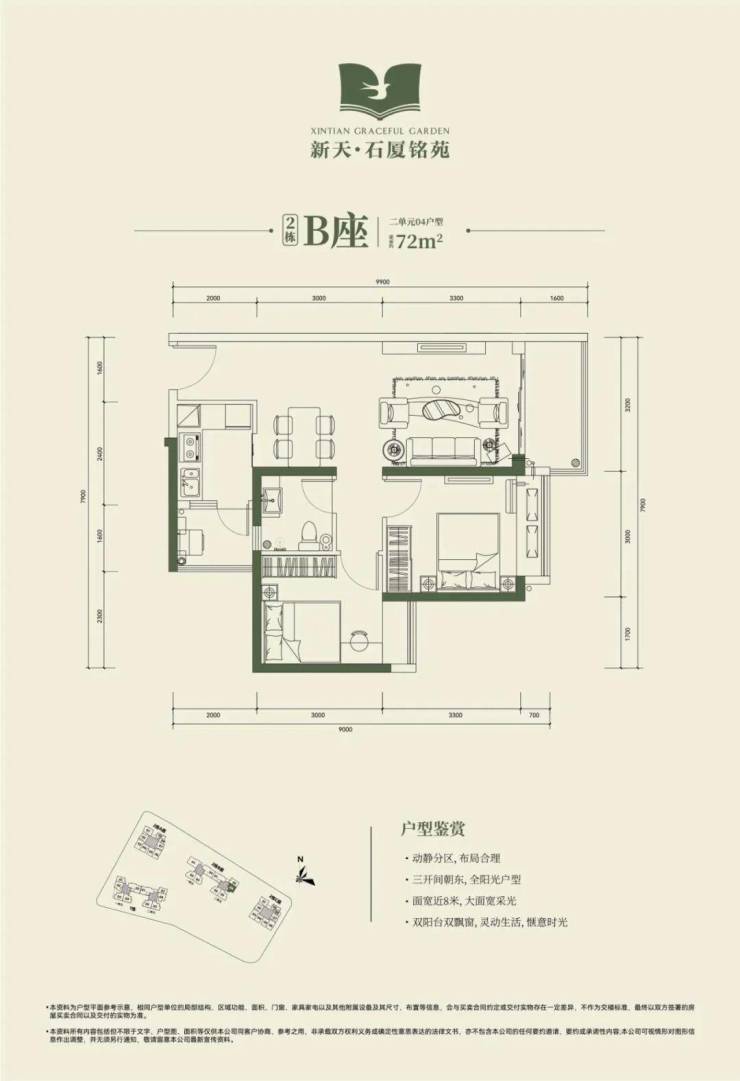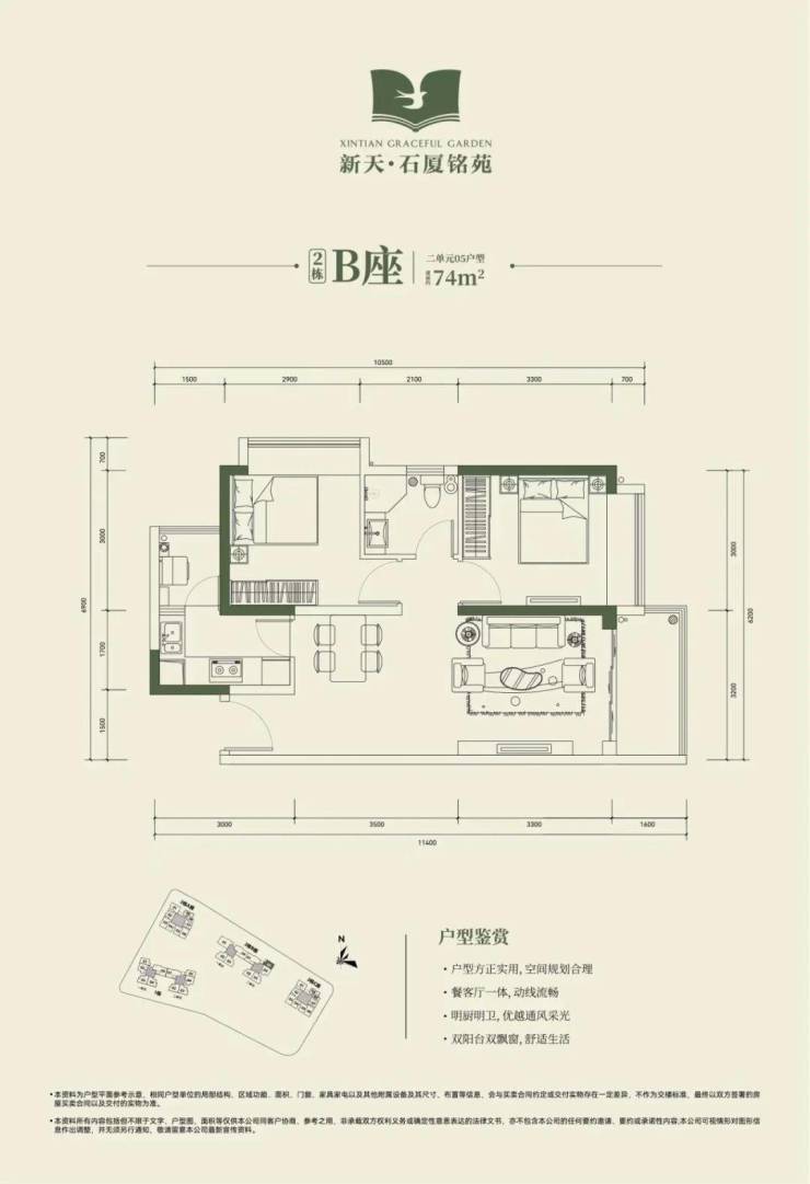 2栋B座二单元04、05户型:面积约为72-74㎡的2房2厅1卫