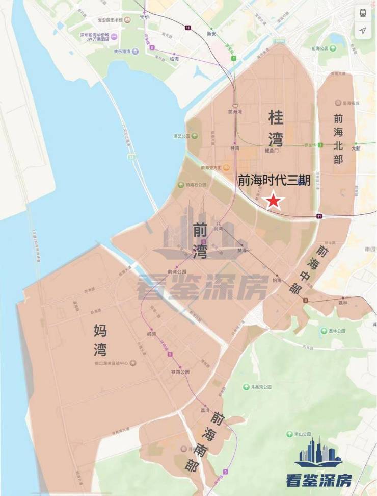 「前海时代三期尊府」位于前海桂湾片区南侧,临近滨海大道和桂湾河,在整个前海自贸区内算是住宅的C位,正南侧水廊道公园,东南望南山西南看城市海景。