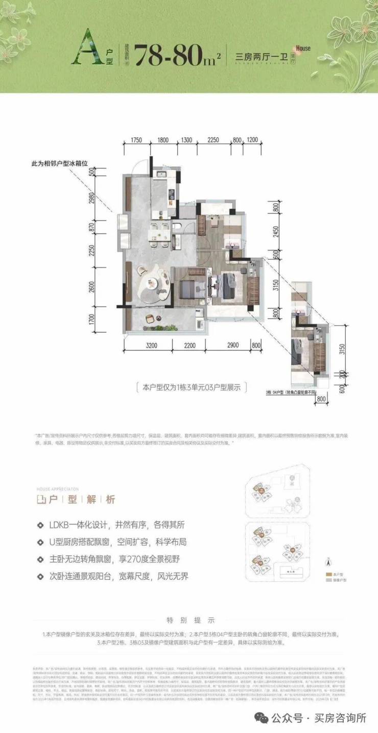 这是建面约80平3房,经典品字型设计,格局方正、动静分区,最大特点是每个空间都非常开阔舒适。