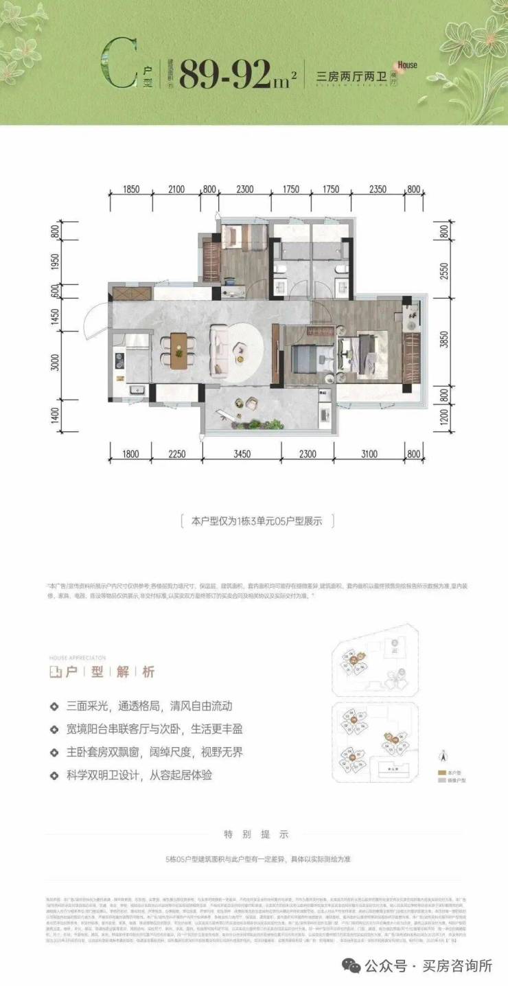 建面约92平3房的阔绰度更是惊人,约105%的得房率,阳台面积超10平,基本和市面主流170平的房子相当。