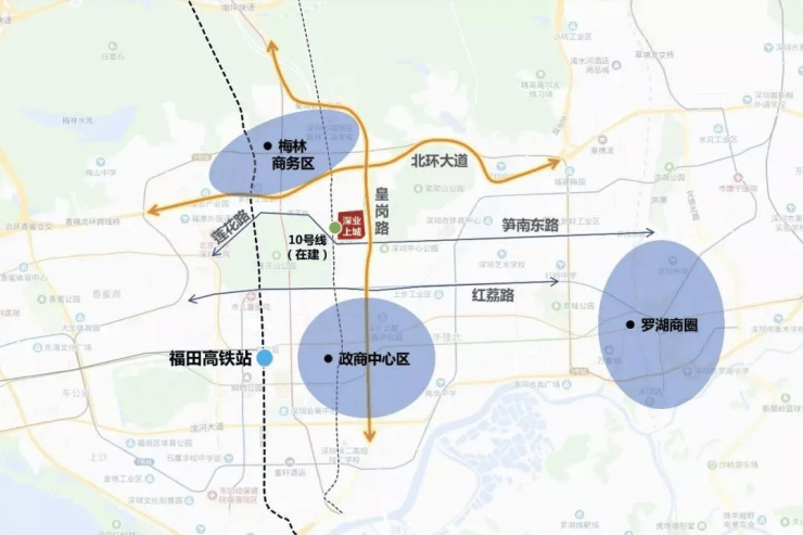占据城市核芯区域,位居福田CBD北门户,南邻政商区,北与梅林商务区、深圳北站商务区无缝衔接,东承罗湖商圈,西瞰南山高新技术产业基地和前海自贸区。