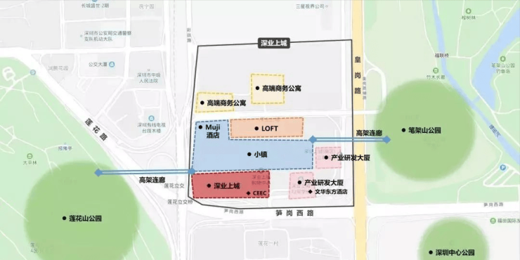 【深业上城公寓】和商业之间有一座天桥,再通过连廊可直达莲花山!
