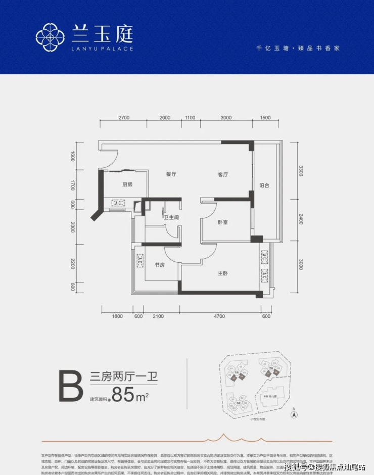 85㎡的3房2厅1卫,B户型,设计的是竖厅格局,客厅开间3.3米,LDKB一体化,三开间朝南,3个卧室分别做到了3米/2.7米/2.4米的宽度,客厅连接次卧出5.7米长的大阳台,L型厨房,创新式三分离卫生间,得房率约79%(不含赠送),西南或东南朝向。