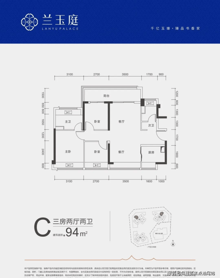94㎡的3房2厅2卫,C户型,设计的是竖厅南北通透格局,客厅开间3.5米,3个卧室分别做到了3.1米/2.7米/2.7米的宽度,客厅连接次卧出6.2米长的大阳台,U型厨房,公卫三段式分离,得房率约79%(不含赠送),阳台主朝西北或东北向。