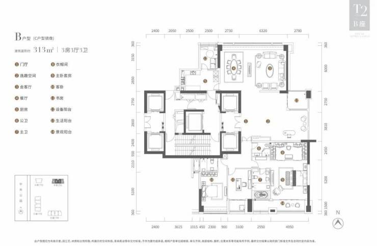A/D户型:313m²三房三厅三卫,南北通透(卧室全南向)