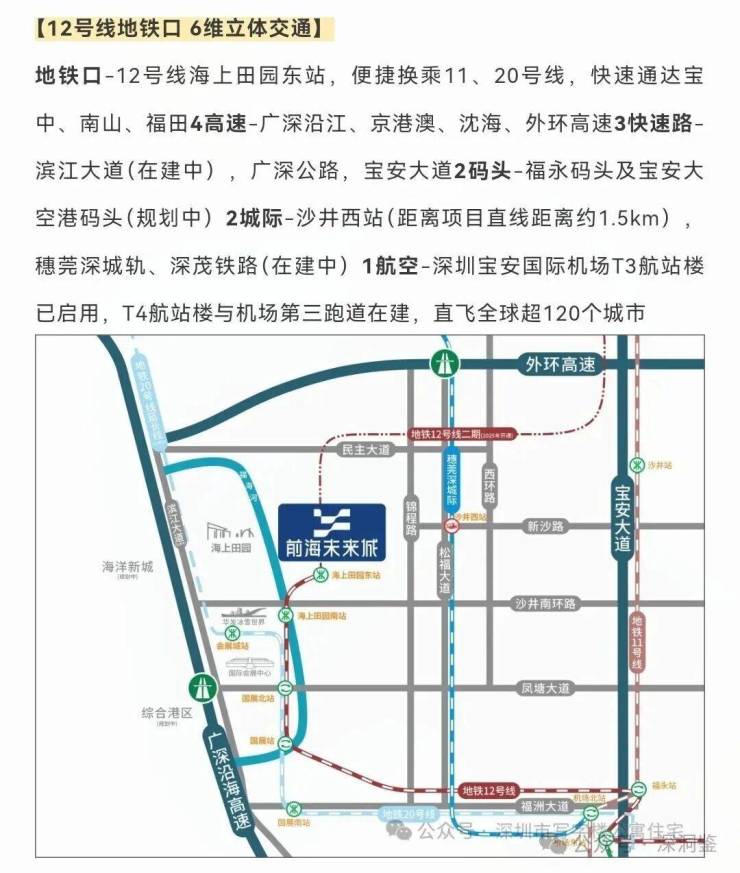 交通。已经通车的地铁 11号线,12号线,20号线一期,直达宝中、南山、前海、福田、蛇口中心。同时可以换乘1号线、5号线,除此之外还有地铁20号线的二期《修建中》,18号线《规划中》。同时,广深沿江高速、外环高速、京港澳高速等多条高速公路贯穿全区,深中通道、穗莞深城际线等重大交通项目在建,未来将进一步提升区域交通条件。
