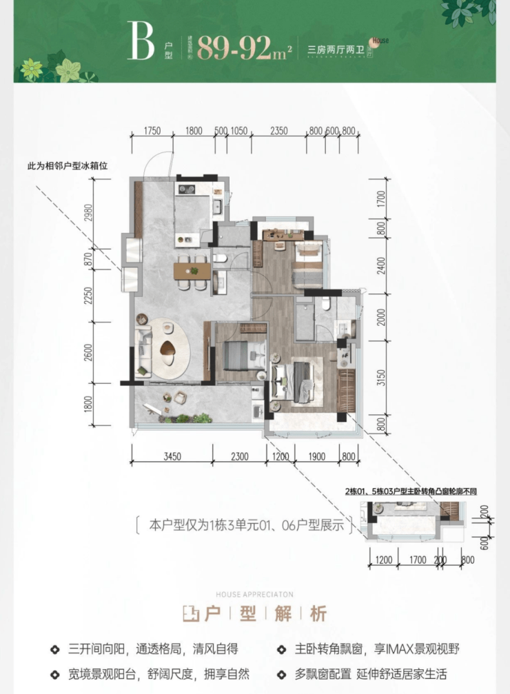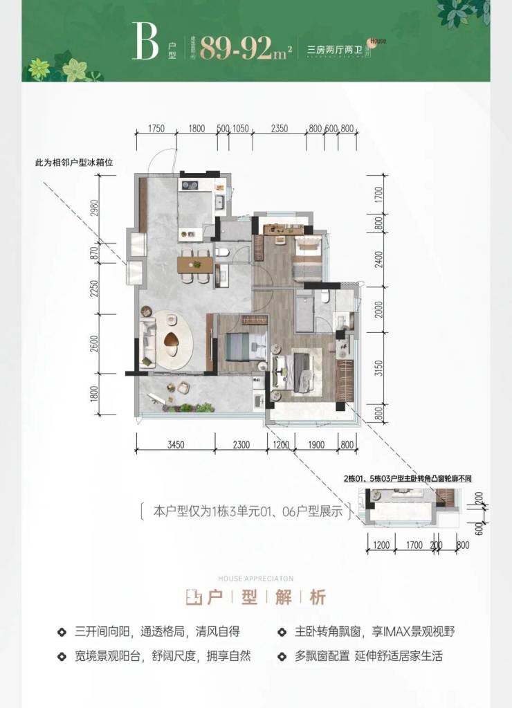 89-92㎡的3房2厅2卫,B户型,设计的是竖厅格局,客厅3.45米开间,3个卧室分别做到了主卧18.1㎡/次卧9.44㎡/次卧5.98㎡(包含墙体飘窗),客厅连接次卧出5.75米长的大阳台,得房率约93-99%(包含赠送),西南或东南朝向。