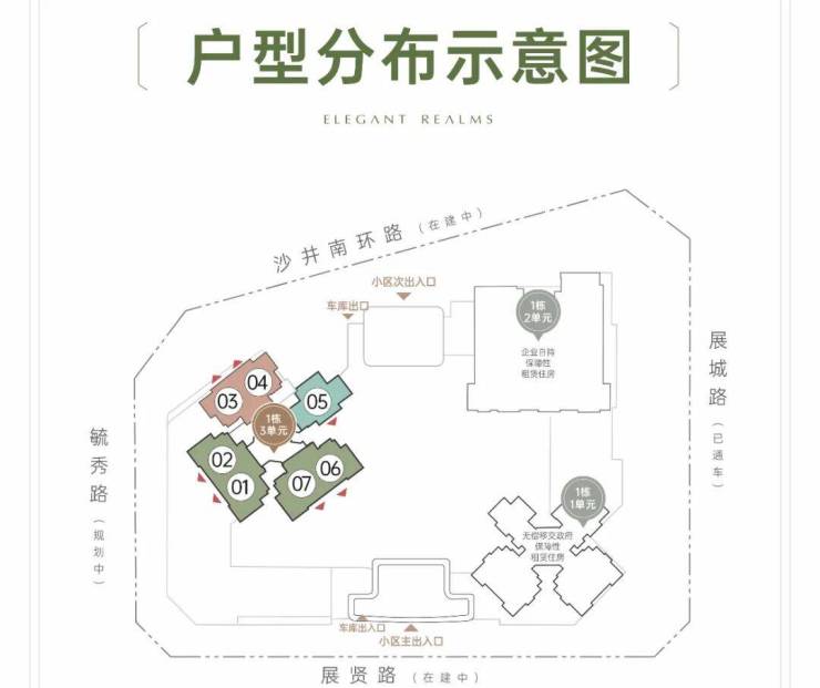 招商会展湾名邸共由6栋总高26-31层高的住宅组成,其中1栋1单元公租房26F,1栋2单元自持租赁30F,1栋3单元/2栋住宅31F,3栋/5栋住宅32F,4栋是1所9班制幼儿园。