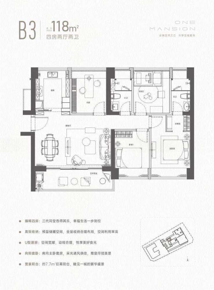 设计的横厅南北通透格局,客餐厅4.2米开间,全屋飘窗设计,四开间朝南,4个卧室分别做到了3.2米/2.9米/2.9米/2.7米的宽度,U型厨房,约7.7米长超大阳台,得房率72.47%(不含赠送),阳台主朝东南向。