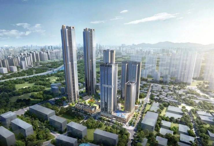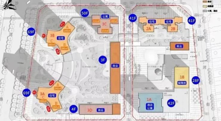 占地4.2万㎡,容积率6.63,分为两期不同地块。一期为1栋A座为150米高公寓+酒店、1栋B座为92米高保障房、2栋A/B座位为138米回迁住宅。
