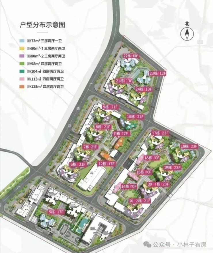 2号地块:6/7/8/9/10栋商品房21F,11/12栋商品房17F,13栋是幼儿园。