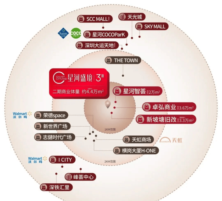家门口超13万㎡商业(盛境约4.4万㎡,卓弘星辰约3.6万㎡(在建)、智荟约2万㎡),约2公里范围内覆盖30万㎡商业,繁华商圈拥簇,酣熟生活即刻兑现。5公里内更享百万平商业,星河COCOPark(龙岗山姆会员店)、SKY MALL、天光城等知名商业体环伺,尽揽都市繁华便利。