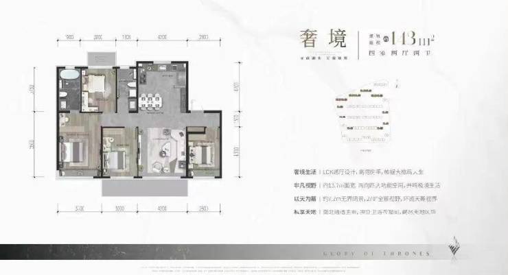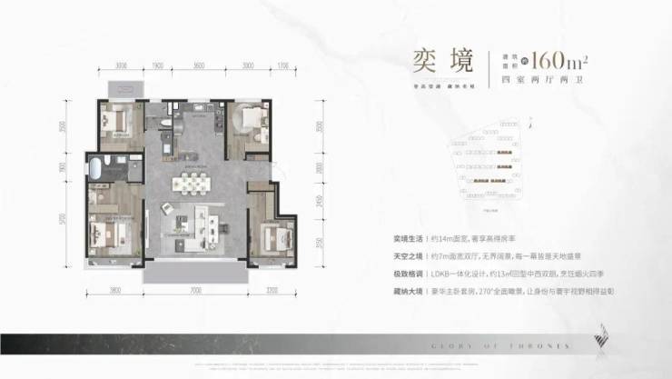 空间营造上,充分考虑室内归家的礼序感、空间的延申性、各功能空间的交融性,建面约120㎡、143㎡、160㎡、187㎡四个户型的设计均领先于市场